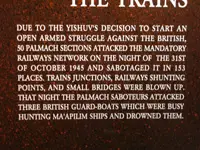 This display culminates with the quelling of the Arab Revolt, the White Papers, and the outbreak of World War II (1939). It depicts the story of the voluntary Jewish enlistment to the British Army, the establishment of the Palmach and the Jewish Brigade Group, the encounter with European Holocaust survivors and displaced persons, and the beginnings of "the escape" (briha) and illegal immigration movements.