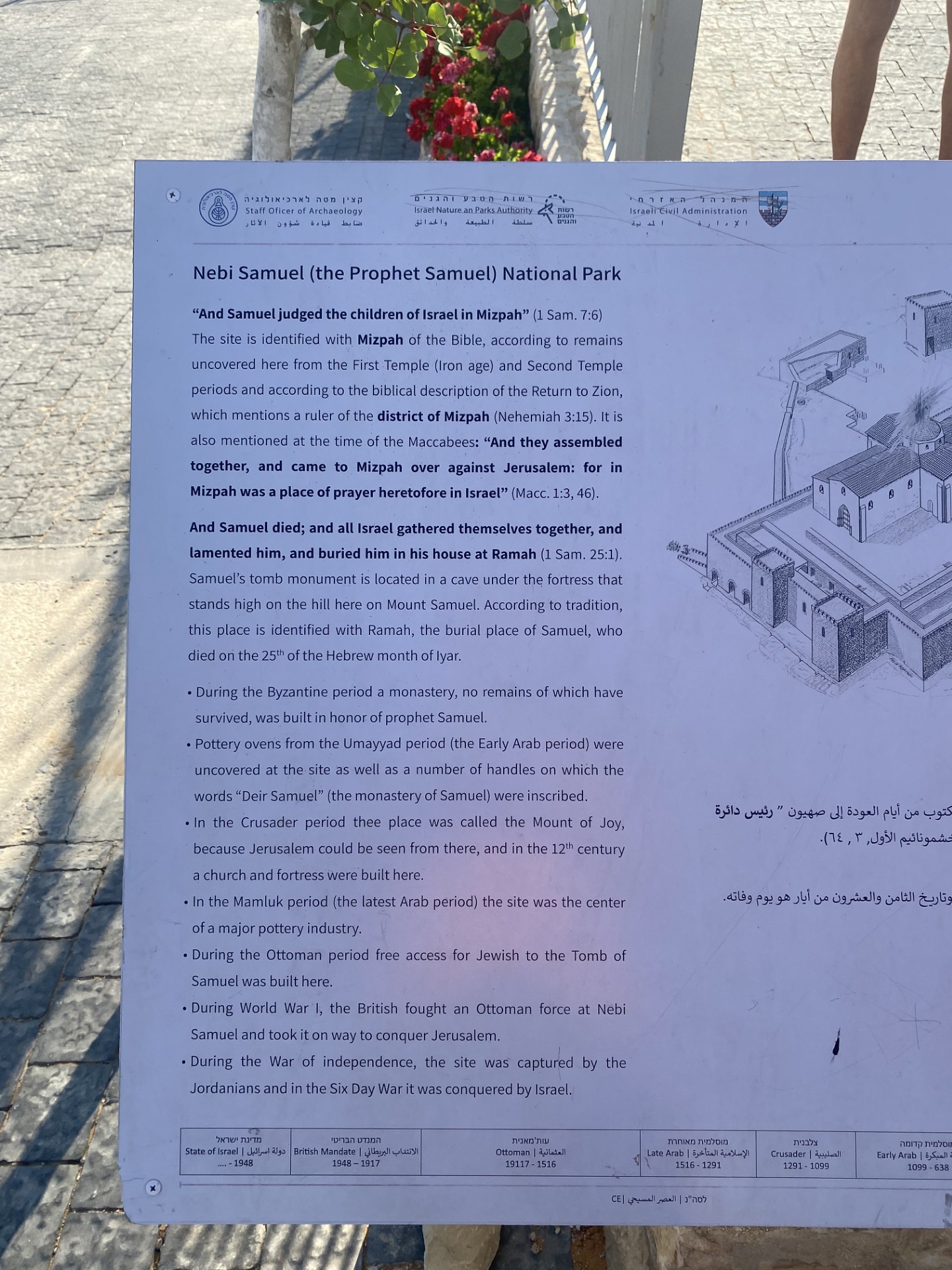 In the ensuing centuries, Nebi Samwil, as the traditional tomb of the prophet Samuel, became a place of pilgrimage for Jews, until a mosque was builtthere in 1730. It was badly damaged in 1917, during a battle between British and Turkish forces. The mosque was restored after World War I and took on its present appearance.