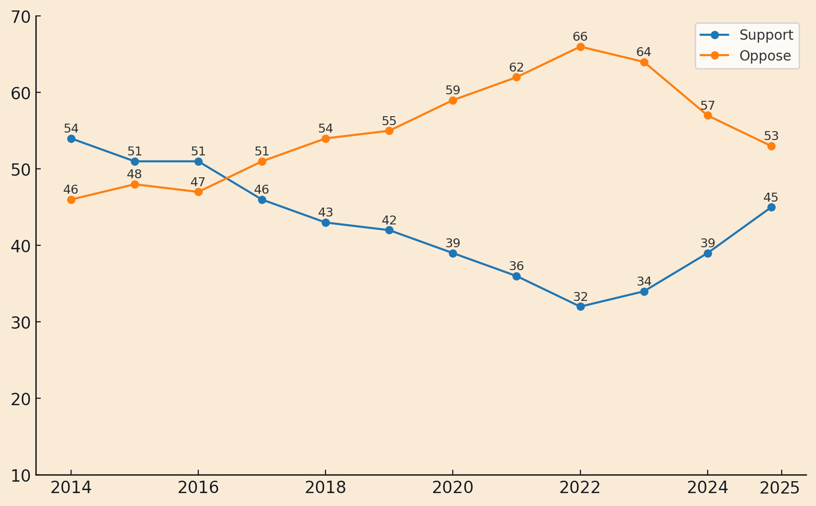 | Oppose | 49% | 46% | 51% | 47% | 51% | 54% | 59% | 62% | 66% | 64% | 57% | 57% |